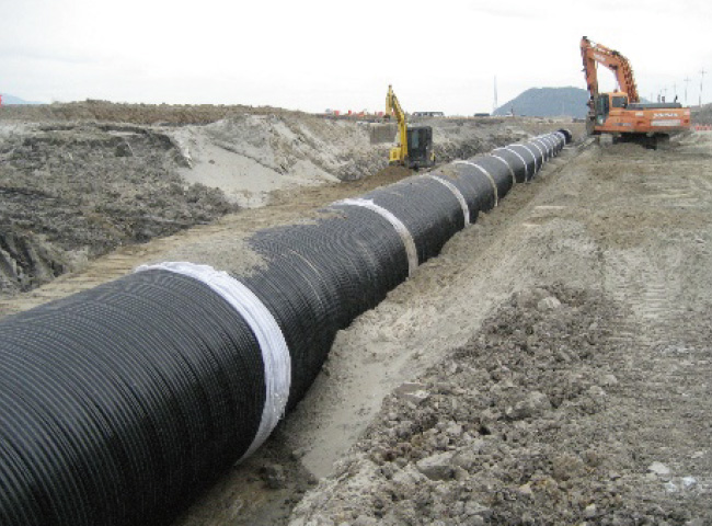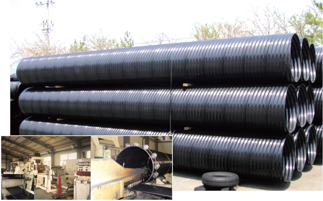 기존의 파형강관 원재료인 내식도금강판에 고내식성 PE(Polyethelane) SHEET를선피복하여 파형 성형한 제품으로 내마모성 및 내식성과 외압강도 향상시킨 이상적인 배수관